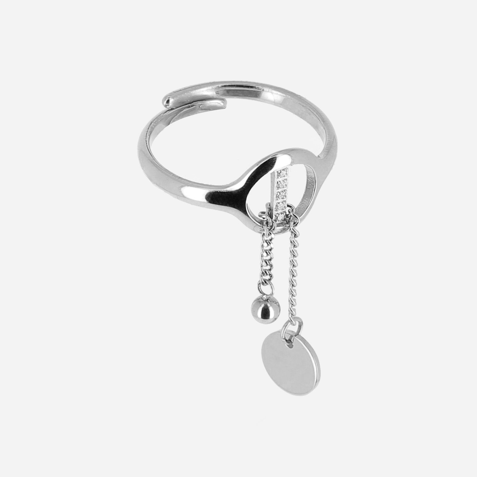 Bague ajustable en acier uni ou doré à l’or fin avec un rond au centre serti de deux chainettes. L’une est sertie d’une petite boule en acier et l’autre d’une petite pastille en acier.