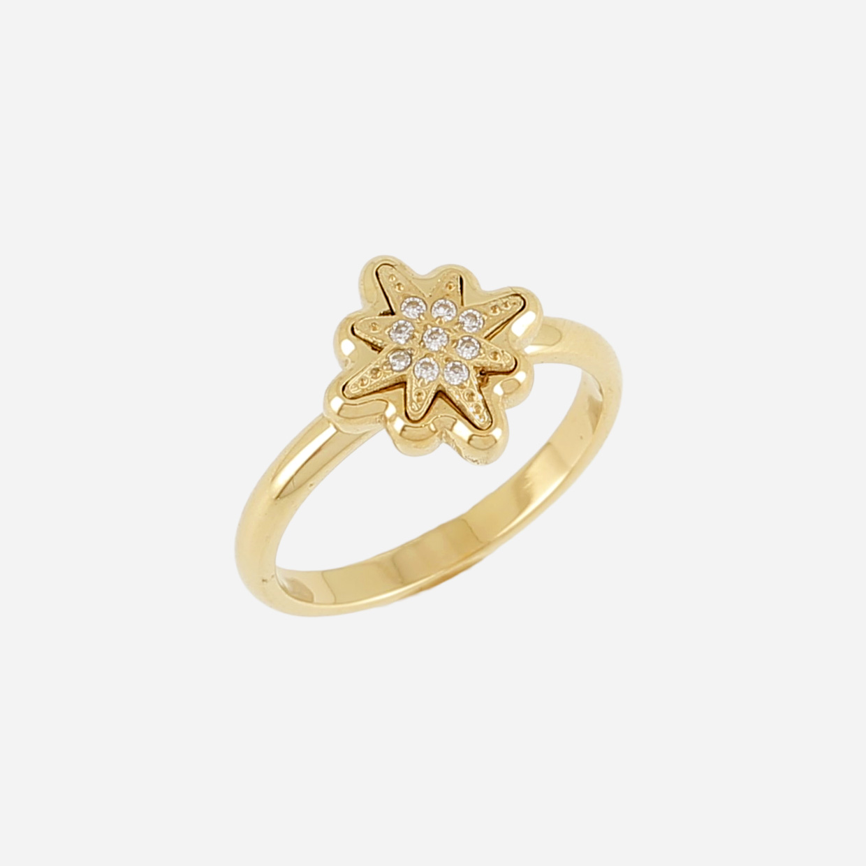 Bague ajustable en acier uni ou doré à l’or fin par ionisation serti d’une pastille en forme d’étoile en acier sur laquelle sont sertis plusieurs zirconiums.