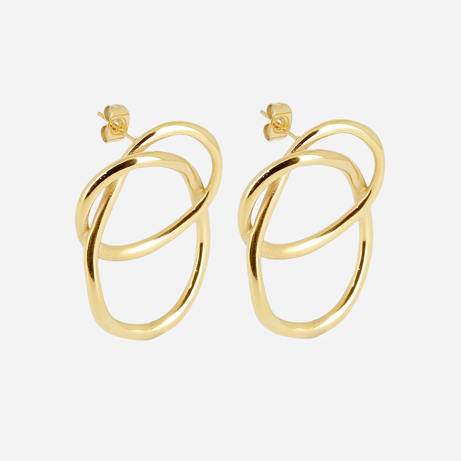 Boucles d’oreilles en acier uni ou doré à l’or fin par ionisation. Elles se composent de 2 formes arrondies qui s’entremêlent.
