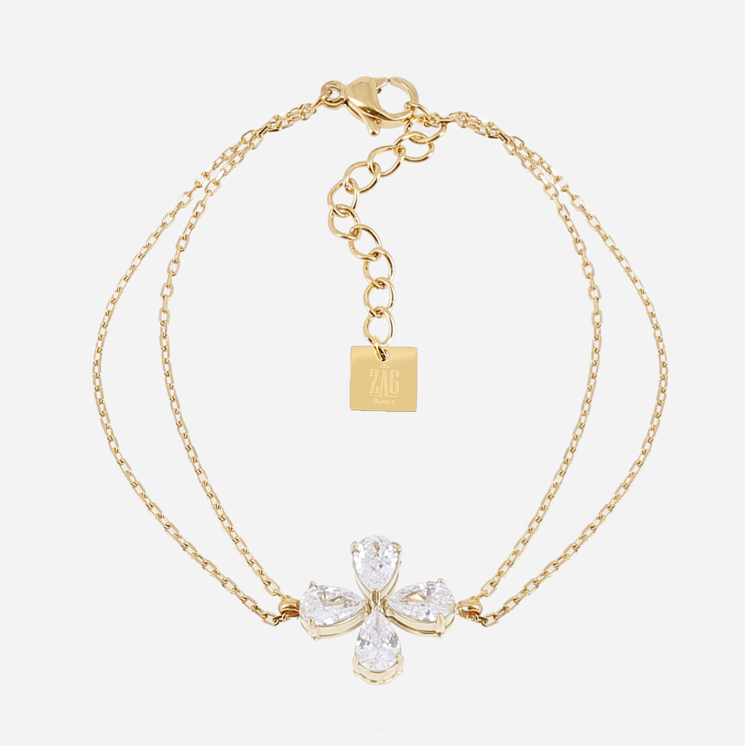 Bracelet multi rangs en acier uni ou doré à l’or fin par ionisation serti d’une fleur en zirconium colorés.
