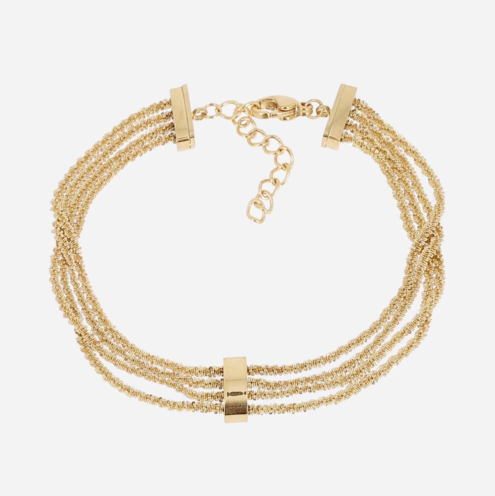 Bracelet à maillons multi-rangs en acier uni ou doré à l’or fin par ionisation composé d’une maille marguerite serti d’un empiècement en métal au centre.