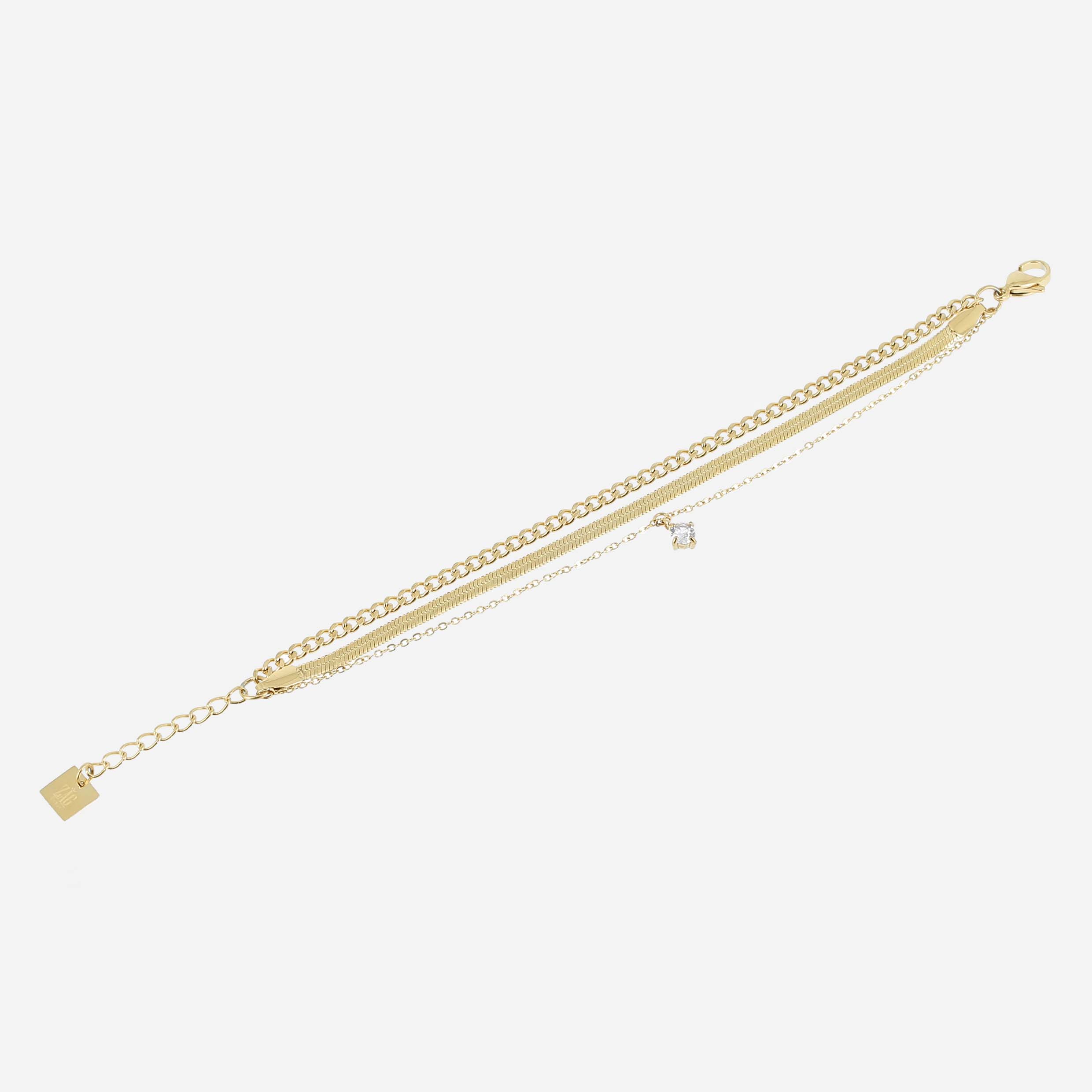 Bracelet multi rangs en acier doré à l’or fin par ionisation composé de 3 types de maillons différents et serti d’un zirconium.
