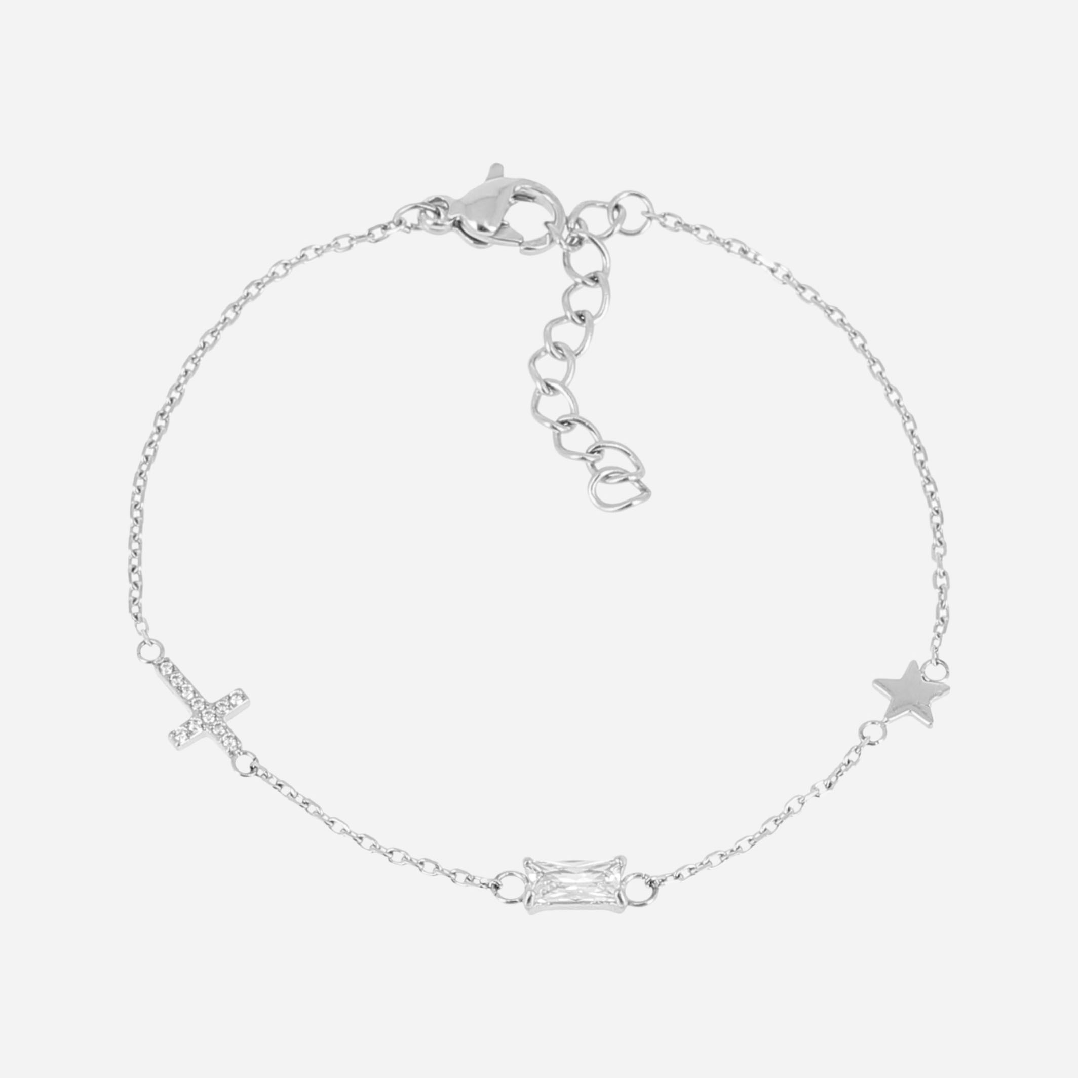 Bracelet en acier uni ou doré à l’or fin par ionisation, serti d’une étoile en acier, d’un rectangle en zirconium ainsi que d’une croix sertie de zirconiums.