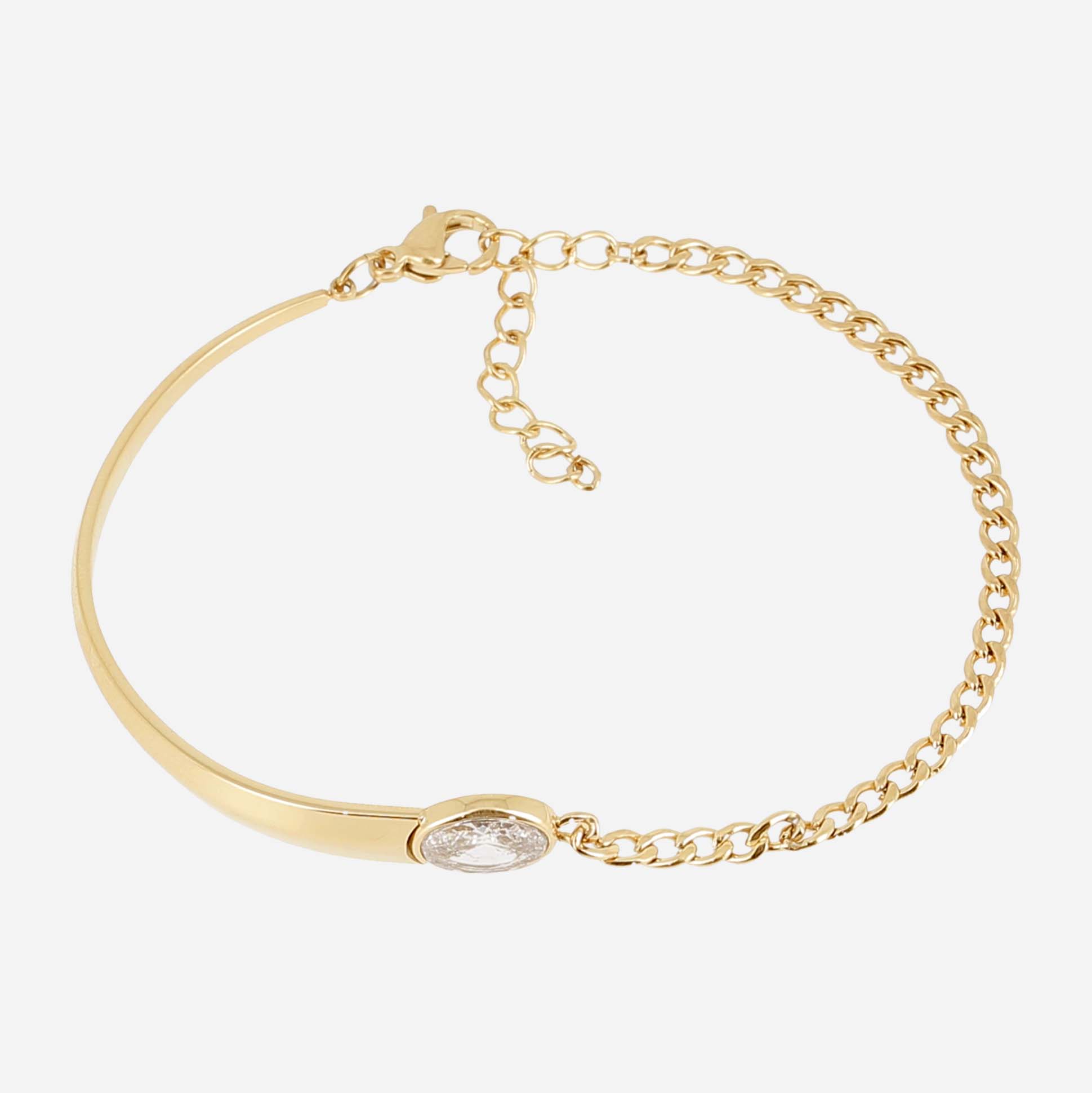 Bracelet jonc fin en acier uni ou doré à l’or fin par ionisation. Il est composé d’une moitié de jonc et d’une chaine de l’autre côté. Sur le dessus est serti un empiècement ovale avec un zirconium.