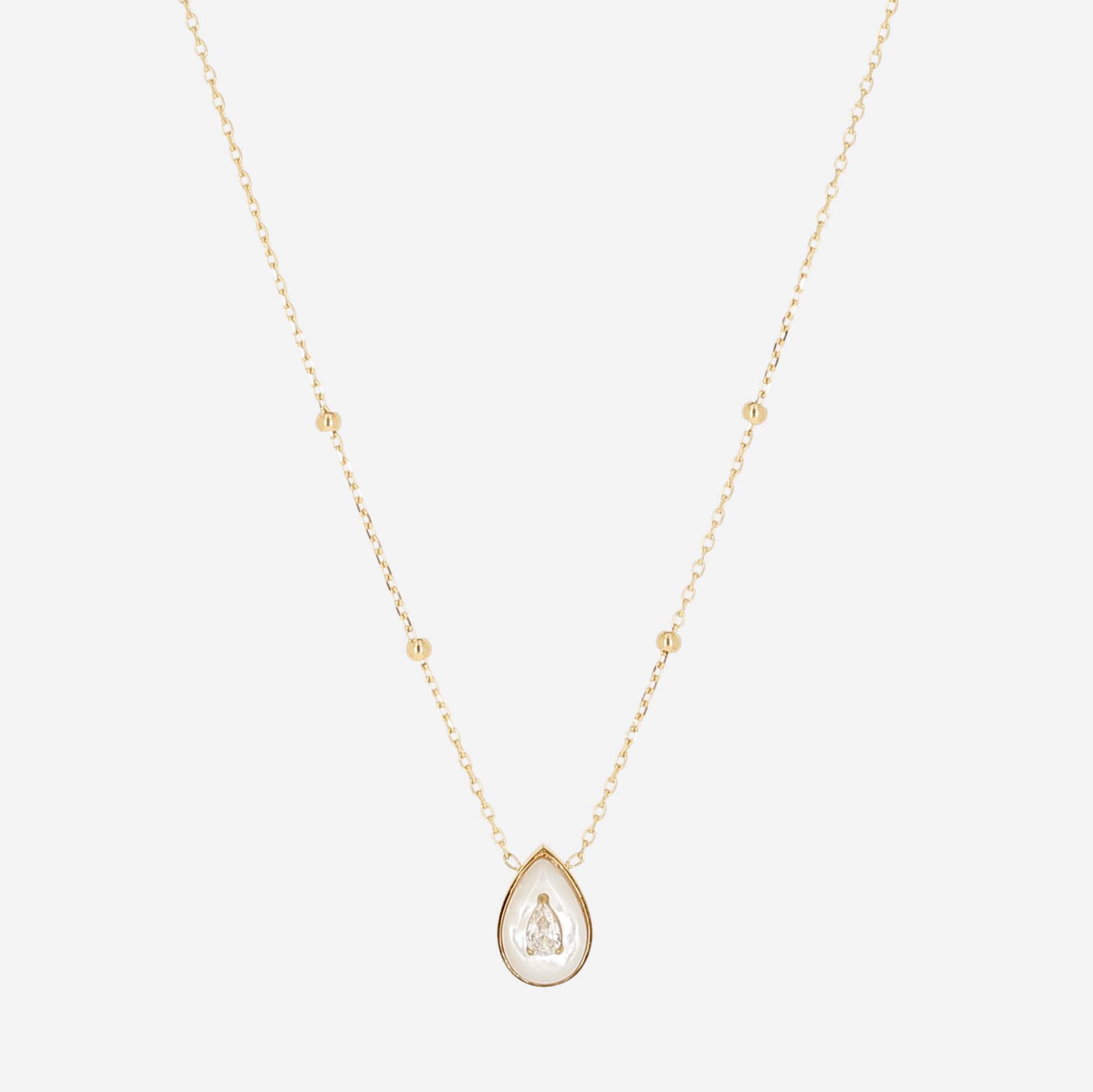Collier en acier uni ou doré à l’or fin par ionisation serti d’un pendentif en forme de goutte sertie d’une nacre.
