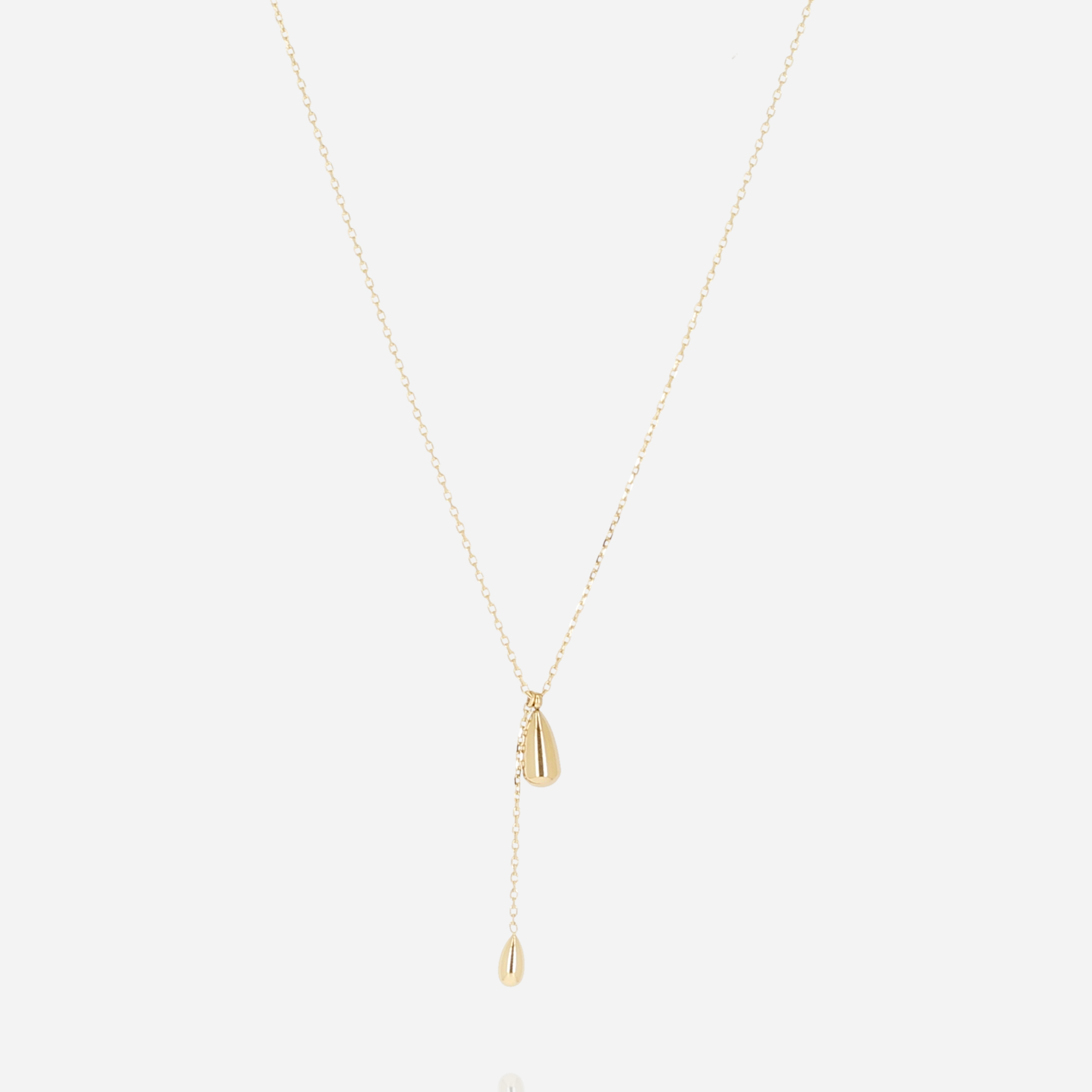 Collier en acier doré à l’or fin par ionisation serti de 2 pendentifs en forme de goutte, l’un est relié à une chainette donnant un effet de cascade.