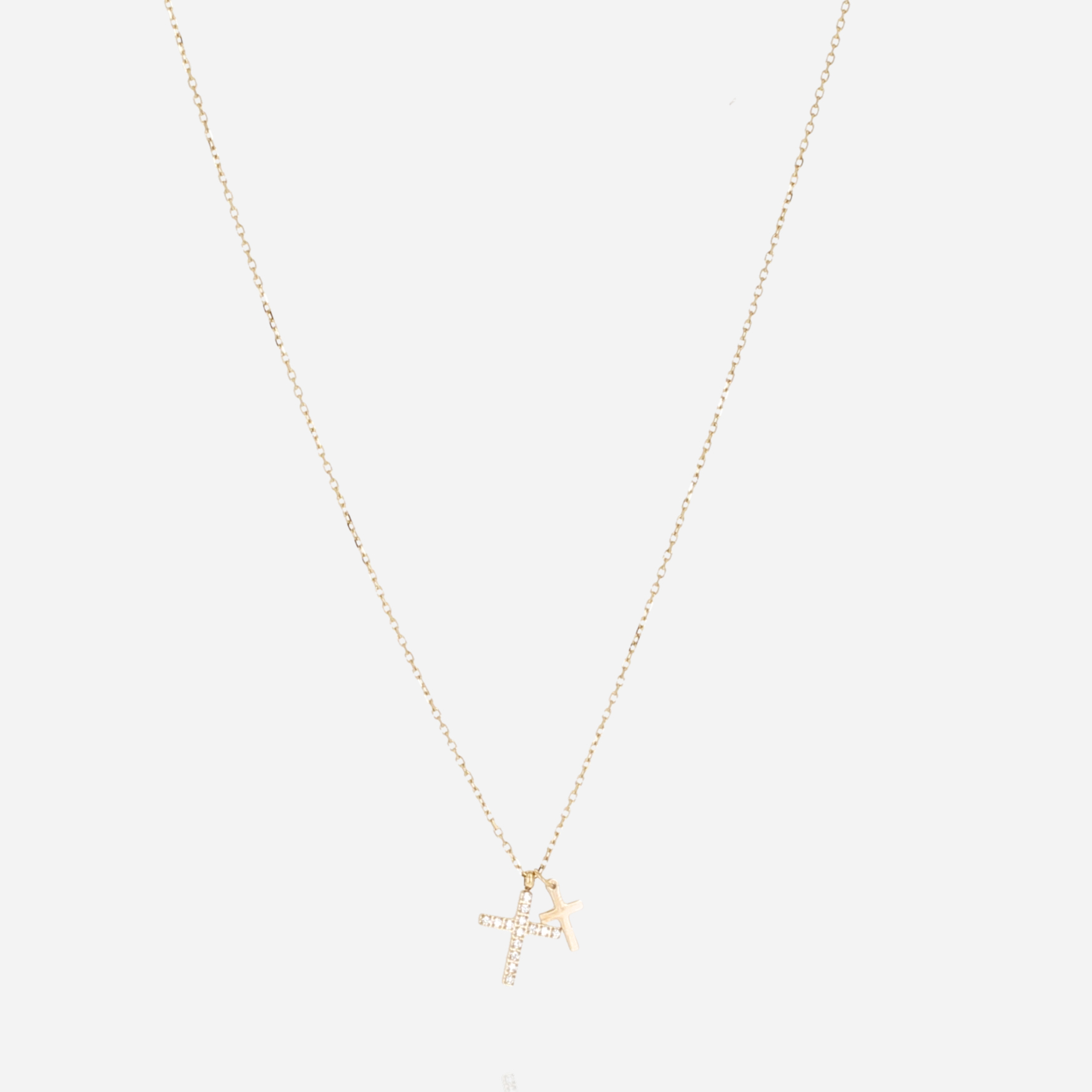 Collier en acier doré à l’or fin par ionisation serti d’une 2 croix de tailles différentes, l’une est sertie de zirconiums.